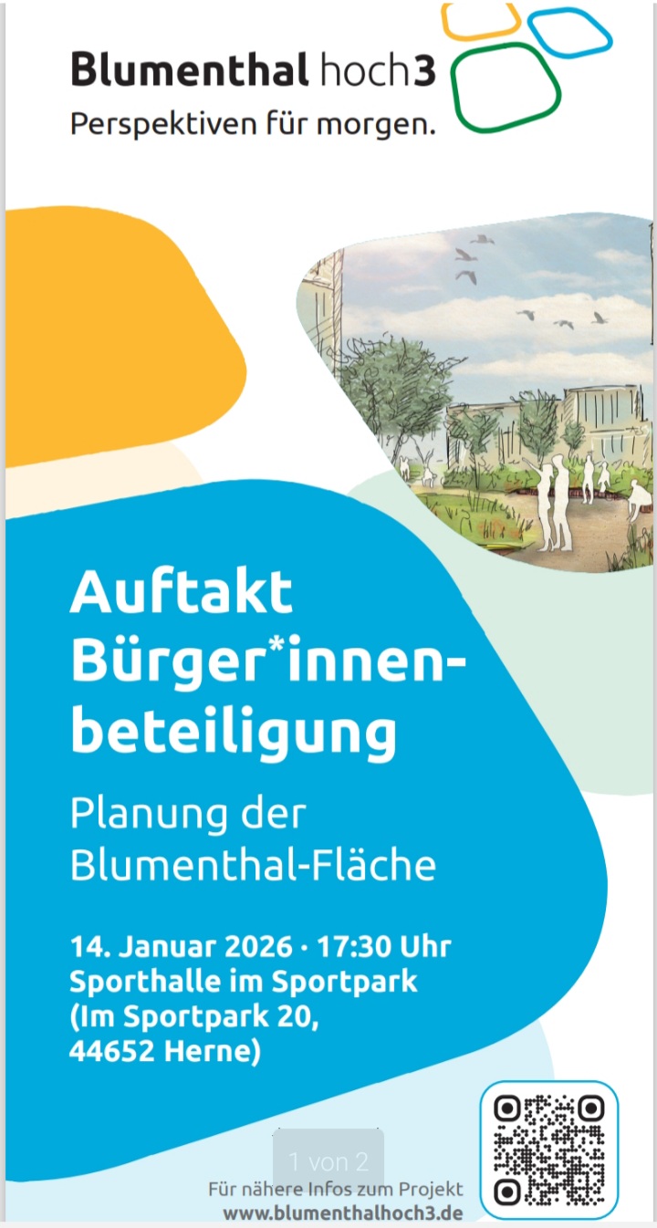 „Als Termin für die Dialogveranstaltung steht der 14. Januar 2026 bereits fest: An diesem Tag laden BEG und Stadt Herne interessierte Bürger*innen in der Zeit von 17:30 bis 20:30 Uhr in die „Sporthalle im Sportpark“, Im Sportpark 20, 44652 Herne, ein.“