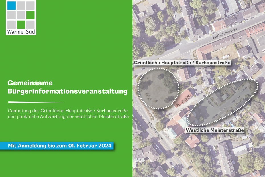 Im Rahmen des Stadterneuerungsprojekts „Soziale Stadt Wanne Süd“ soll die Grünfläche an der Hauptstraße / Kurhausstraße gestaltet und die westliche Meisterstraße punktuell aufgewertet werden. Sie sind herzlich eingeladen, hierzu an der gemeinsamen Bürgerinformationsveranstaltung im Gemeindezentrum St. Joseph teilzunehmen.