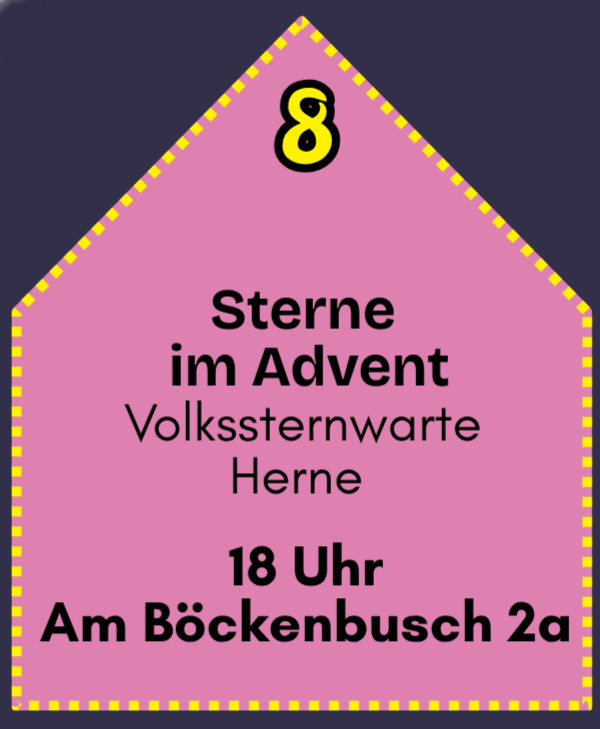 Am 8. Dezember um 18 Uhr sind Familien mit Kindern und alle anderen Interessierte an der Sternwarte Herne (am Böckenbusch 2a) zu einer Sternenbeobachtung eingeladen. Mitglieder des Vereins geben hier auch eine Vorführung des Planetariums.