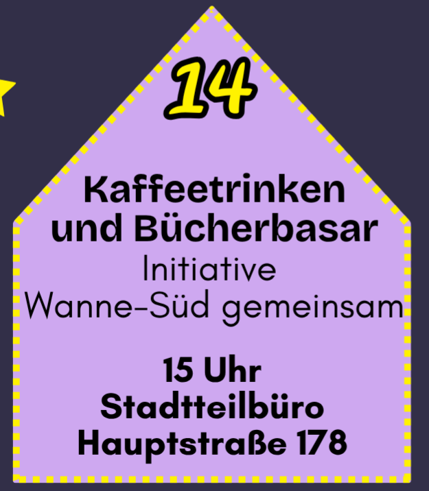 Die Initiative Wanne-Süd gemeinsam lädt am zweiten Advent, Sonntag, 14. Dezember 2025, in der Zeit von 15 bis 17 Uhr, alle Nachbarn zum Adventskaffeetrinken mit Bücherbasar ins Stadtteilbüro, Hauptstraße 178, ein. Bei bei Kaffee, Tee, selbstgebackenem Kuchen und Plätzchen wollen die Initiatoren mit den Bürgern ins Gespräch kommen.