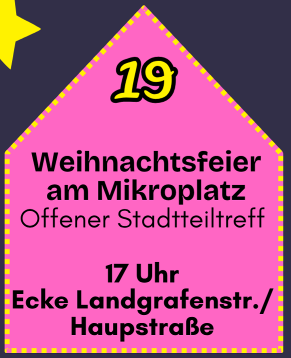 Wir laden alle Nachbarn zum Offenen Stadtteiltreff ein - diesmal in der Winter-Edition! Wo? Auf dem Mikroplatz vor dem Pizzahaus (Hauptstraße / Ecke Landgrafenstraße). Wann? Am 19. Dezember von 17 bis 19 Uhr. Was noch? Für das leibliche Wohl ist gesorgt! Bitte an warme Kleidung, Mütze und Handschuhe denken, möglichst auch eine Decke oder Sitzkissen… Weiterlesen »Offener Stadtteiltreff: Weihnachtsfeier am Mikroplatz