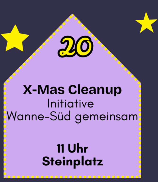 Clean Up-Aktion "Wanne-Süd gemeinsam" lädt alle Menschen, die sich gemeinsam für einen sauberen und lebenswerten Stadtteil engagieren möchten, zur monatlichen Müllsammelaktion ein. Treffpunkt ist um 11 Uhr am Steinplatz. Eine Anmeldung ist nicht notwendig. Handschuhe, Greifer und Müllsäcke werden bereitgestellt. Die Aktion endet gegen ca. 12:30Uhr.