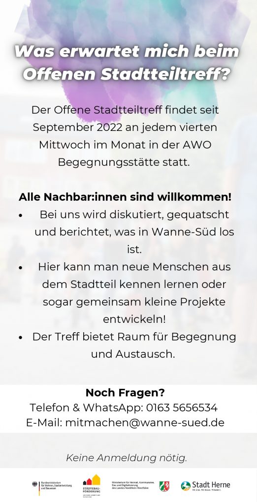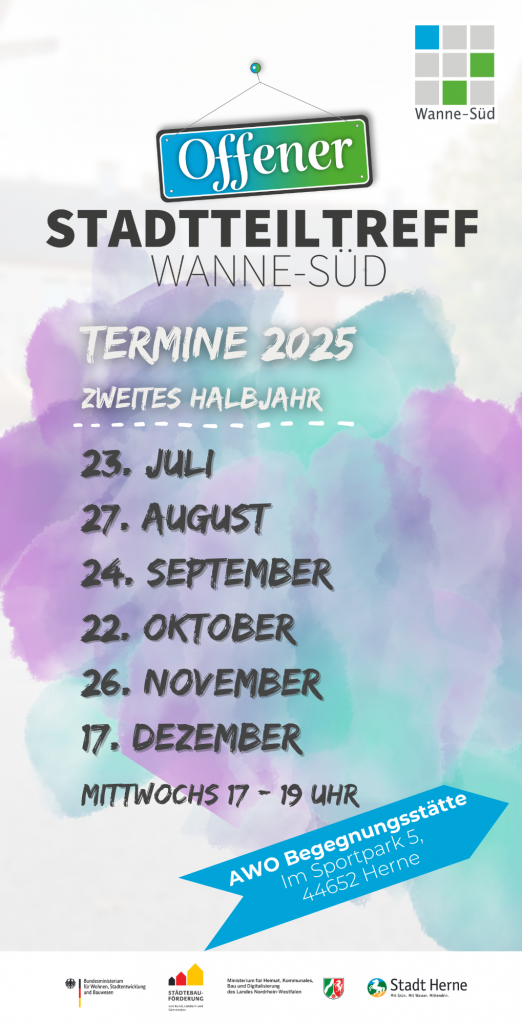 Seit September 2022 findet an jedem 4. Mittwoch im Monat in der AWO Begegnungsstätte ein Offener Stadtteiltreff statt. Alle sind Nachbar*innen sind Willkommen. Hier können Sie mit diskutieren, berichten, was Ihnen an Wanne-Süd gefällt und was nicht, neue Menschen aus dem Stadtteil kennen lernen oder sogar Partner*innen für Ihre Projektideen finden. Der Treff bietet Raum für Begegnung und informellen Austausch. Getränke werden gestellt.