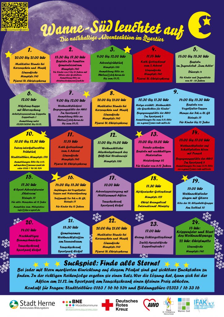 16 Einrichtungen im Stadterneuerungsgebiet Wanne-Süd haben ein Adventsprogramm der besonderen Art entwickelt: Von Donnerstag 1. Dezember bis Samstag 24. Dezember 2022, wird es dort täglich Aktionen für große und kleine Quartiersbewohner*innen geben. Im Vordergrund stehen Aktionen, die den Zusammenhalt im Quartier stärken, Freude, Hoffnung und Begegnung fördern.