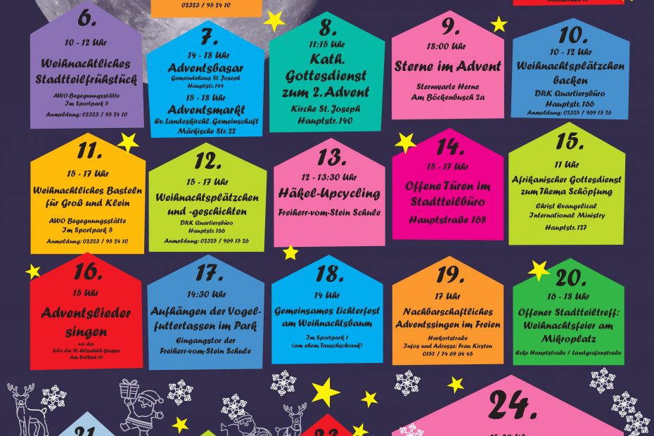 In diesem Jahr erwartet die Bürger*innen von Wanne-Süd ein abwechslungsreiches Programm zur Adventszeit. Unter dem Motto „Wanne-Süd leuchtet auf“ wird die dritte Ausgabe der beliebten Adventsaktion vom Stadtteilbüro Wanne-Süd in Zusammenarbeit mit zahlreichen lokalen Akteuren organisiert.